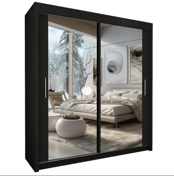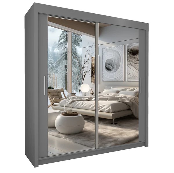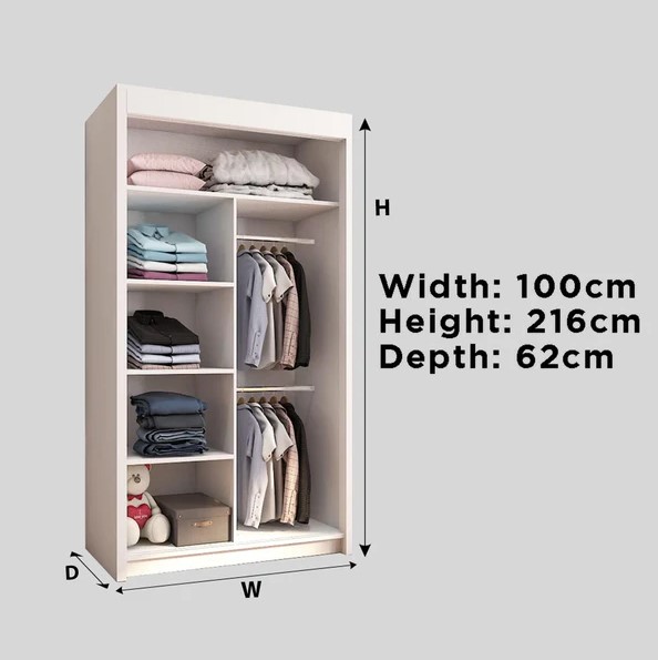 Features: 2 sliding mirror doors, 5 shelves, 2 hanging rails